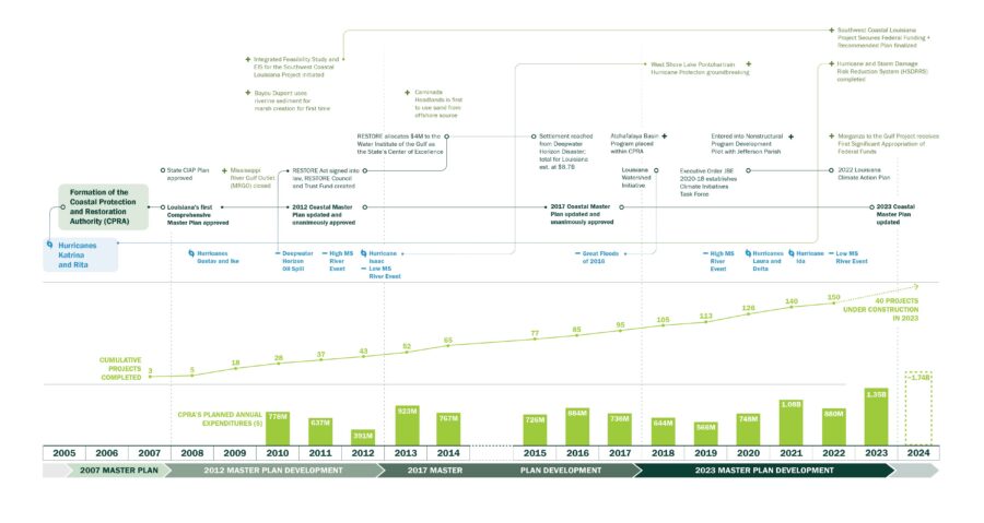 Four master plans have guided the development and implementation of Louisiana’s coastal program since CPRA was established in 2005. The information shown in this figure represents just some of the notable events and key achievements of Louisiana’s coastal program since then. Project implementation metrics are also presented to track accomplishments over time.
