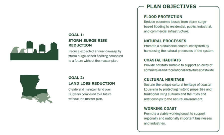 The master plan identifies robust projects that meet the two primary goals of the plan, to reduce [1] storm surge-based flood risk and [2] land loss across the coast both today and into the future. However, those are not the only concerns of coastal Louisiana residents and the master plan is developed with people in mind. To better meet the needs and values of Louisianans, these objectives and principles have been identified. Together, these goals, objectives, and principles reflect years of coastal planning experience and serve as guidelines for developing and implementing a comprehensive coastal master plan.