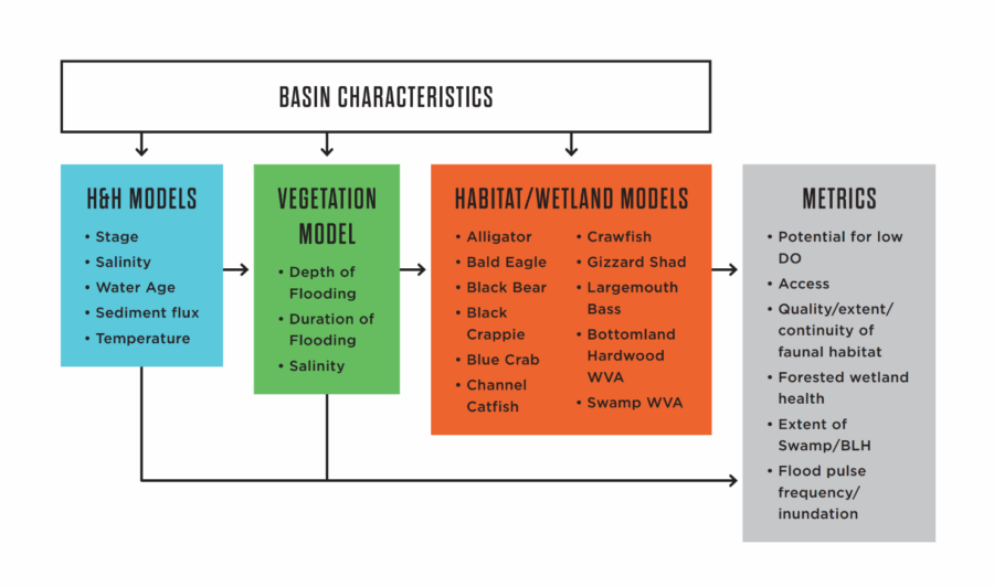The project development team is using different types of models to evaluate how projects perform across the Atchafalaya River System: