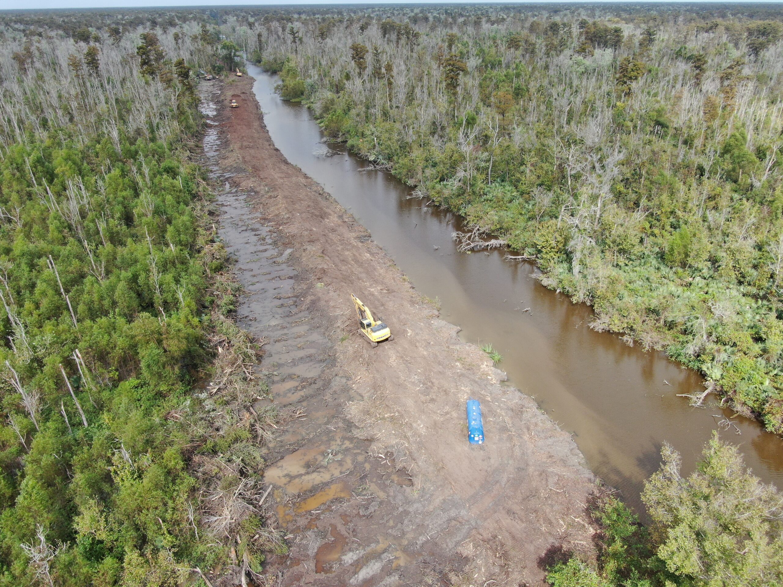 - Aerial view of showing equipment clearing trees and creating debris burn piles along West bank before the pipeline corridor.