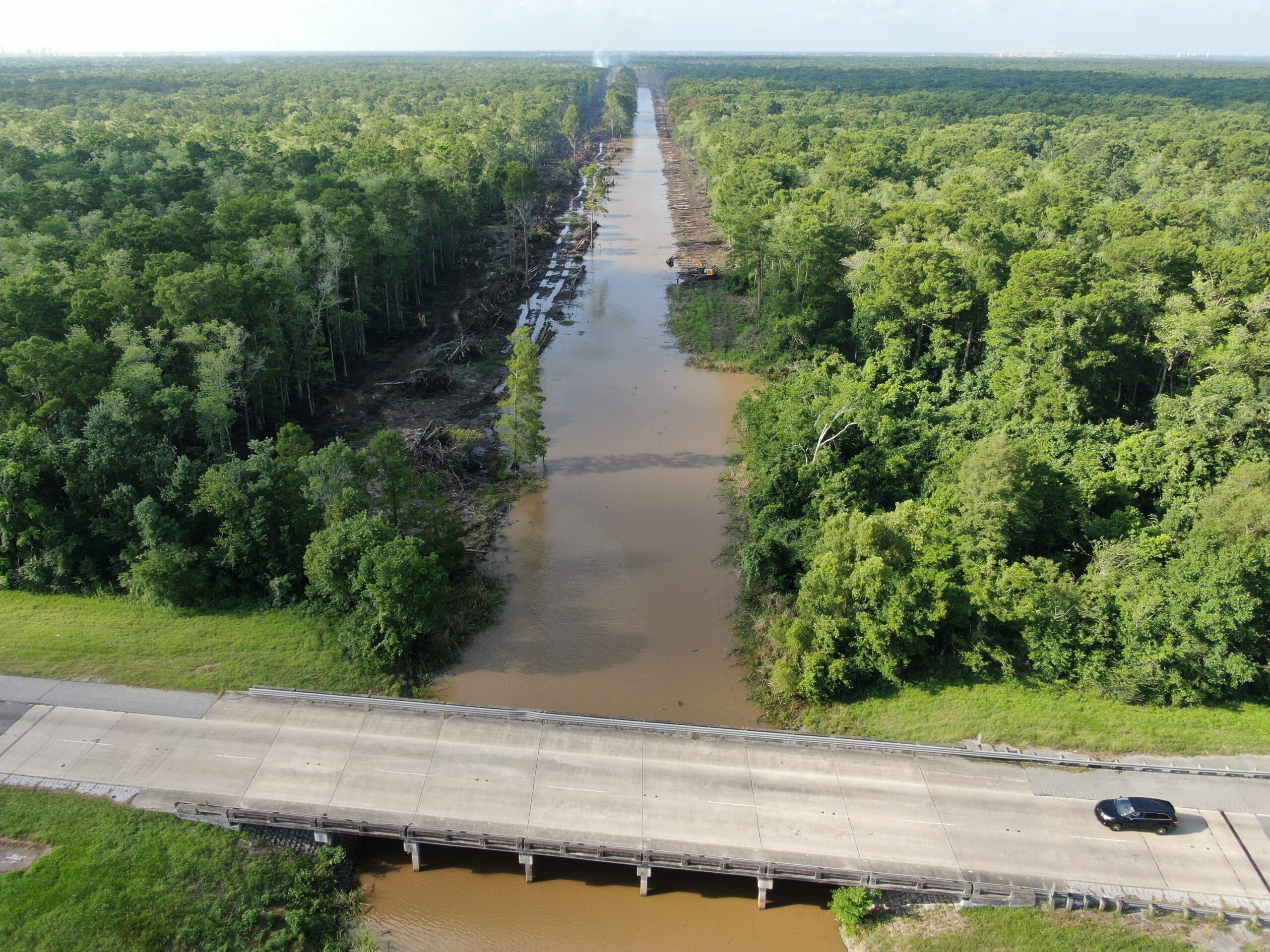 - View of the end of the project from above I-10 looking south (towards airline Hwy). The west side of the project is almost complete building the levee with the 2nd pass. On the east side the clearing and grubbing is almost complete.